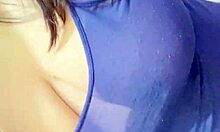 mature woman exposes big tits and fucks pussy with dildo in public showers