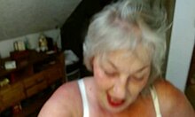 Oh uau, olha a vovó peituda Mariaold se despindo e cavalgando o dildo como cowgirl!