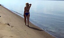 Blondynka z opalenizną pokazuje duży tyłek na ukrytej kamerze plażowej w nudystycznym voyeur klipie