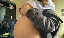Fingering her swollen 37-week pregnant belly and pussy close-up