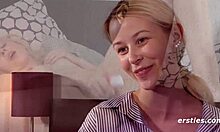 blonde teases wet pussy closeup with big dildo solo play