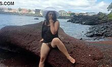 Curvy beach lady strips sexy flashes big pussy in photoshoot