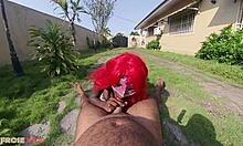 Redhead African big ass slut gets fucked hard in backyard while clueless boyfriend searches nearby