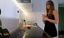 sexy brunette dorm girl in nightie ignores boredom in kitchen