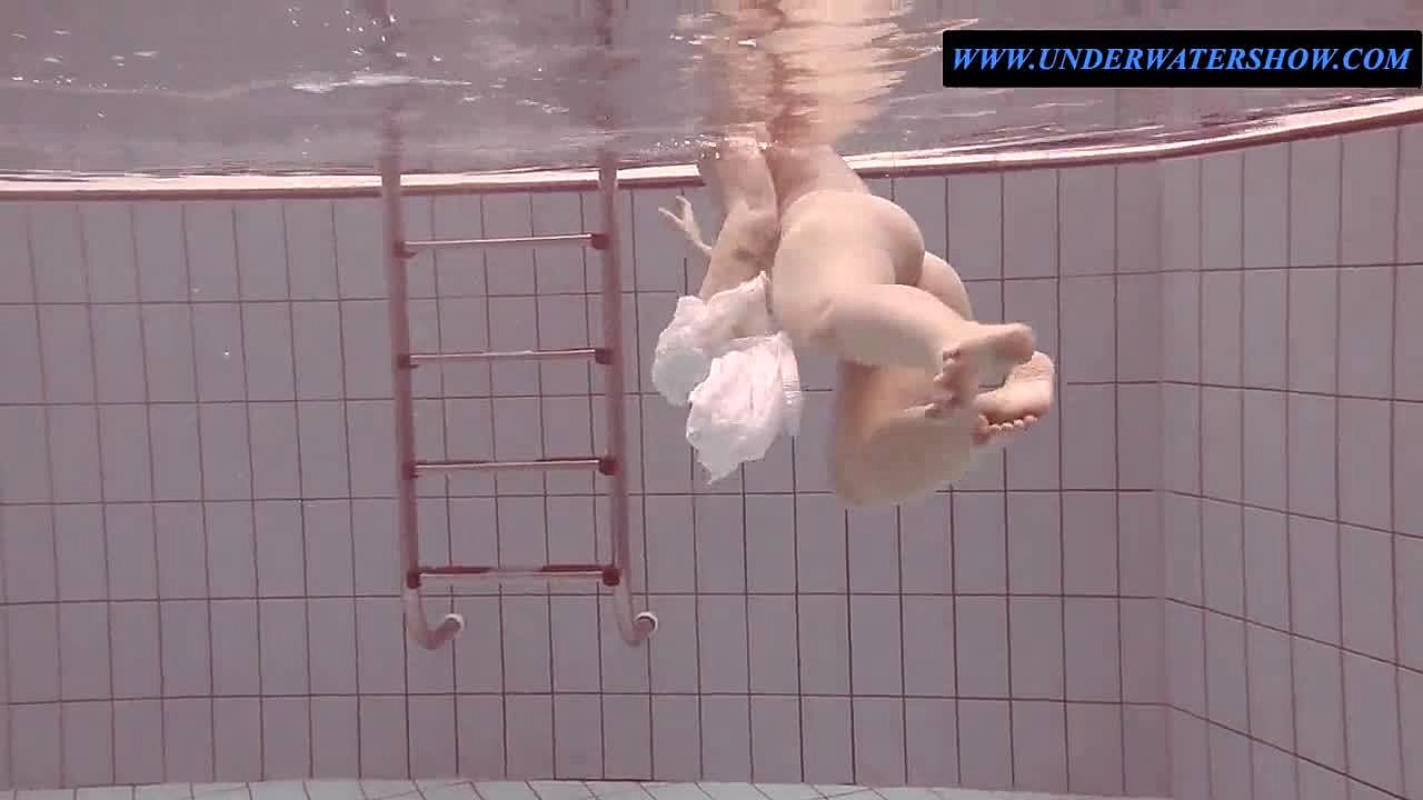 Cute shy Czech teen Lady Dee swimming in pool.