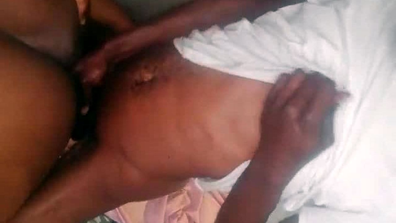 Jovencita negra inclinada para acción interracial en perrito