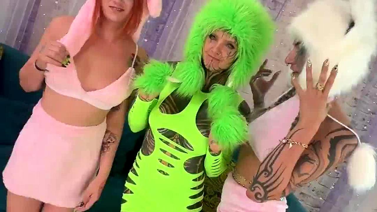 Inked adorable girl slips into cute outfit teases massive dildo ride
